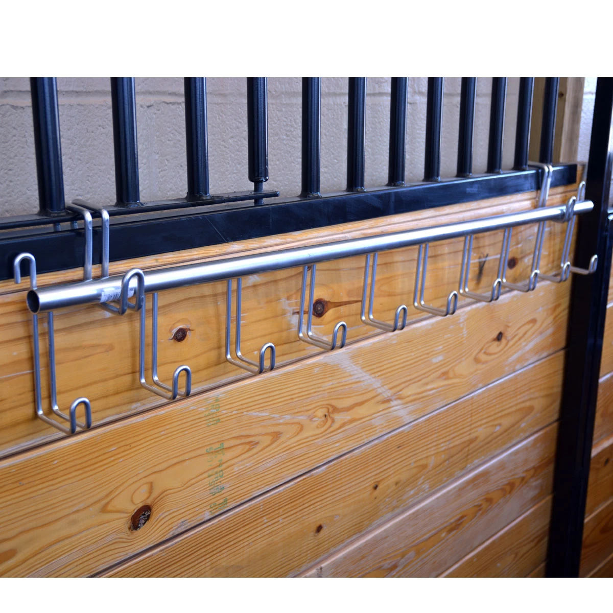 The ten-hook bridle rack is constructed of heavy gauge gray powder coated steel wire and tubing for excellent durability. The versatile design can be mounted permanently in your tack room, barn or stable; or with the addition of 2 utility hooks (Item #27211 sold separately) is a great choice for trailers, shows, boarding and training facilities.