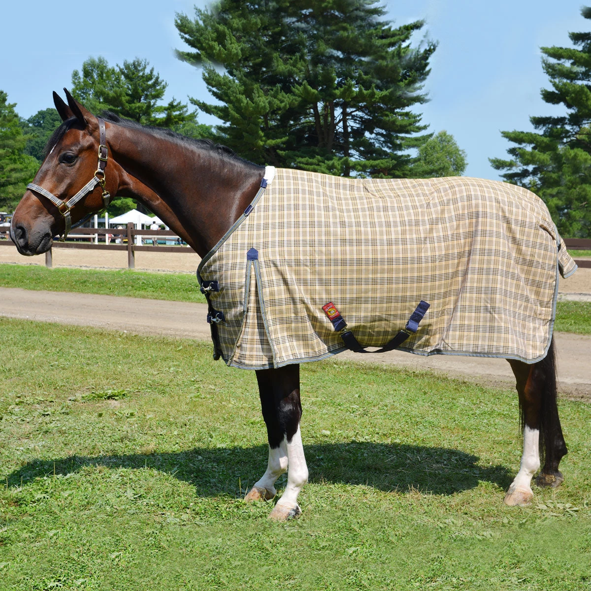 The 5/A Baker heavyweight turnout blanket is great for cold winters! 400 gm of insulation. Featuring gusseted shoulders to allow freedom of movement during play time, elastic hind leg straps to keep the blanket in place, bias surcingle straps and a tail flap. The Baker Turnout Blanket is unique as it allows perspiration to pass through to the outside while maintaining its waterproof outer layer. This mix of breath ability allows the horse to stay dry and comfortable during outside play. The outer shell is a 1,500 denier polyester rip stop fabric. The inner lining is a satin smooth lining that polishes the coat.