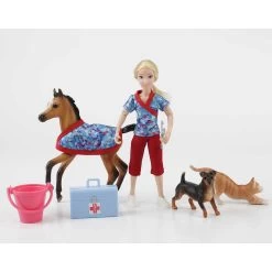 - Includes: 6″ articulated doll, foal, foal blanket, cat, dog, bucket, vet bag, and stethoscope.