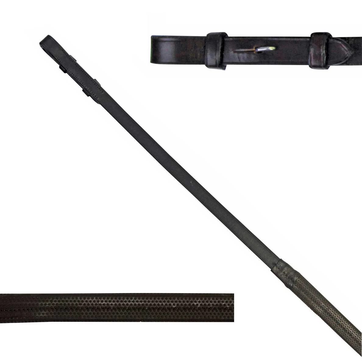 Classic leather reins with rubber grip by Camelot. Hook and stud ends.