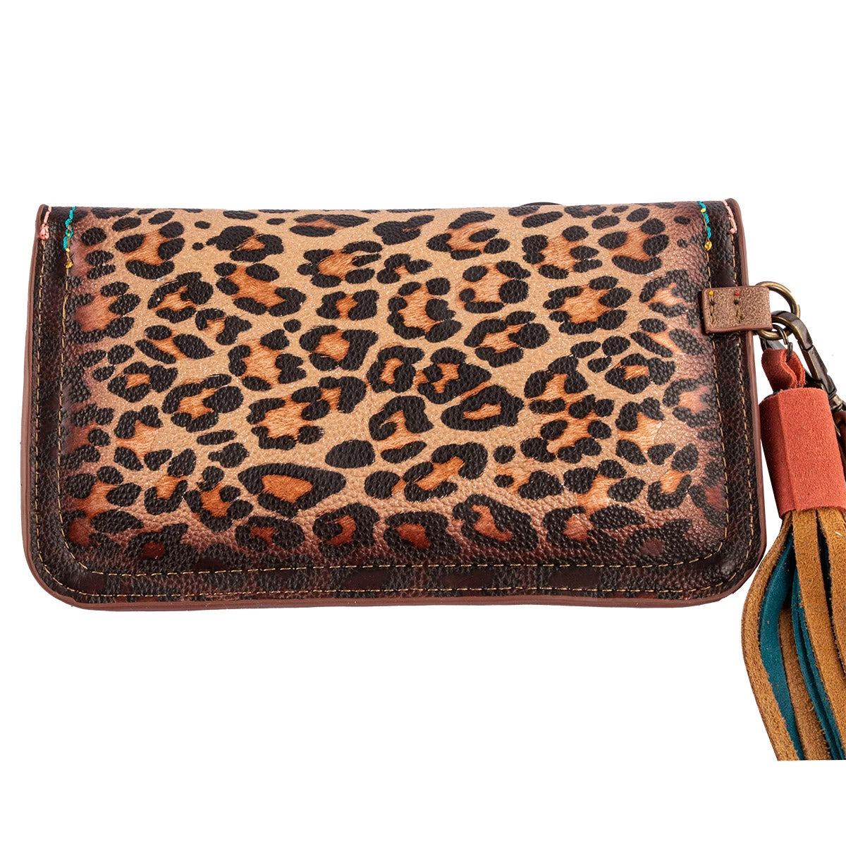 The Catchfly Small Clutch Brown and Leopard features a trendy and leopard patterned clutch with wristlet. With a front flap turn lock clasp closure, one main compartment and three interior credit card slots there is plenty of room for your must have items. On the exterior, this clutch has a beautiful multi color stitching and leopard upper and a multicolor suede tassel.