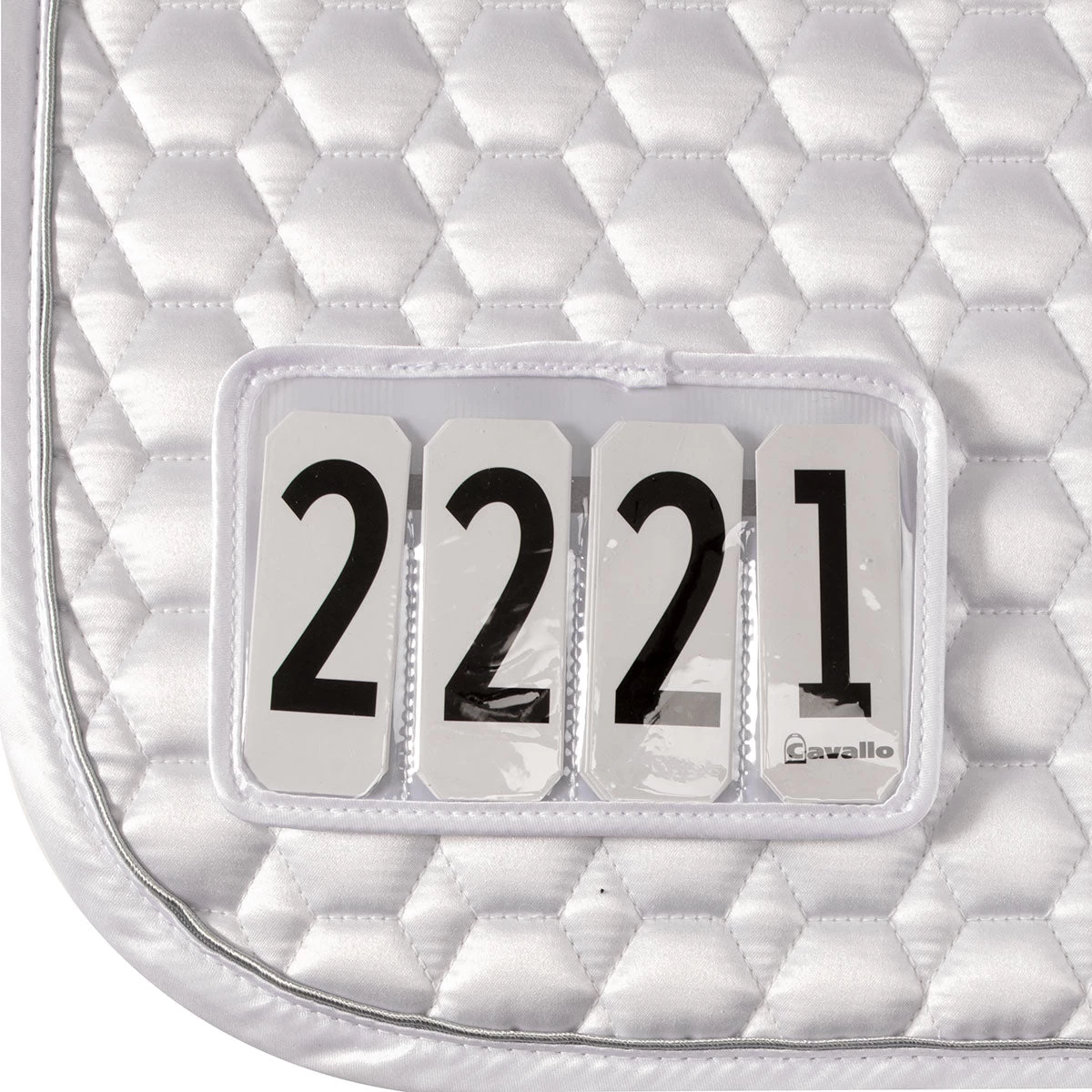 The Cavallo Jolly Dressage Saddle Pad has attractive all over honeycomb quilting and silver piping. A unique fastening system allows one to detach the Cavallo logo patch, and replace it with the included interchangeable number patch. This system is perfect for showing, and allows you to change the number for each show, as well as use the pad for schooling. The pad is quick-drying and moisture wicking with mesh lining and is skin-friendly for the horse.
