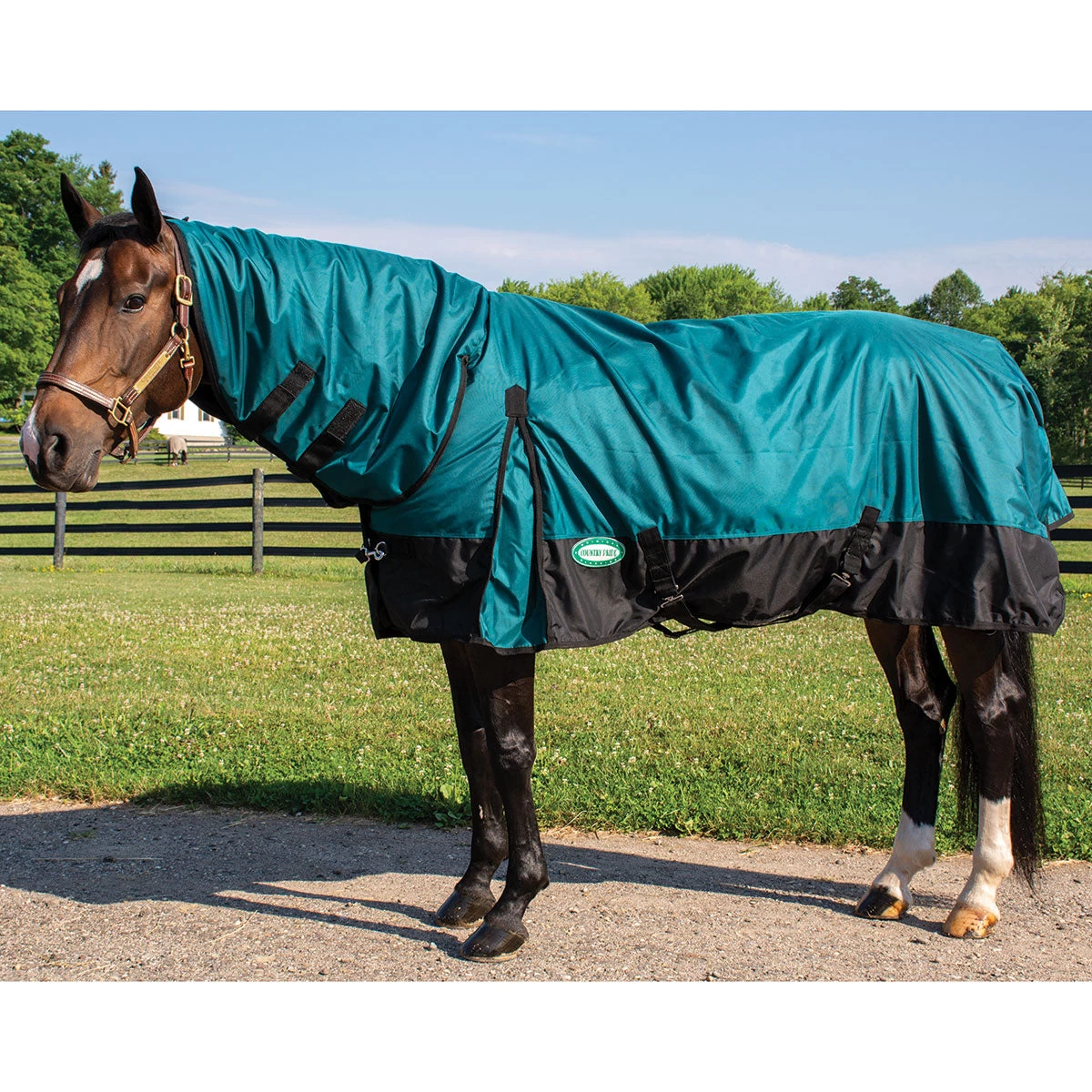 Heavyweight turnout blanket by Country Pride. Made of durable 1680D outershell to keep your horse dry this winter season. Heavyweight 300g polyfill insulation for warmth on those cold winter days with an attached neck cover. Easy pull hook and loop closures on the neck cover for adjustability and double buckle open front snaps on the chest. Dual belly surcingle straps to keep the blanket firmly in place during turnout. Shoulder gussets for freedom of movement and a tail flap to protect against the wind. Comes with hind leg straps. Teal and black two tone color.