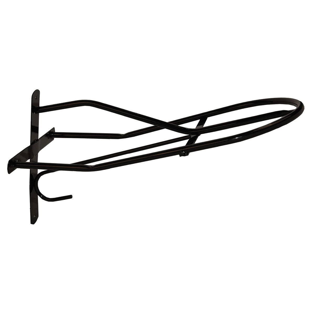 Sturdy English Saddle Rack is vinyl coated steel formed and welded into a strong saddle rack with bridle hook underneath. Great for organizing tack rooms.