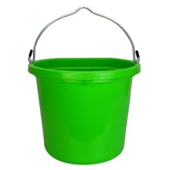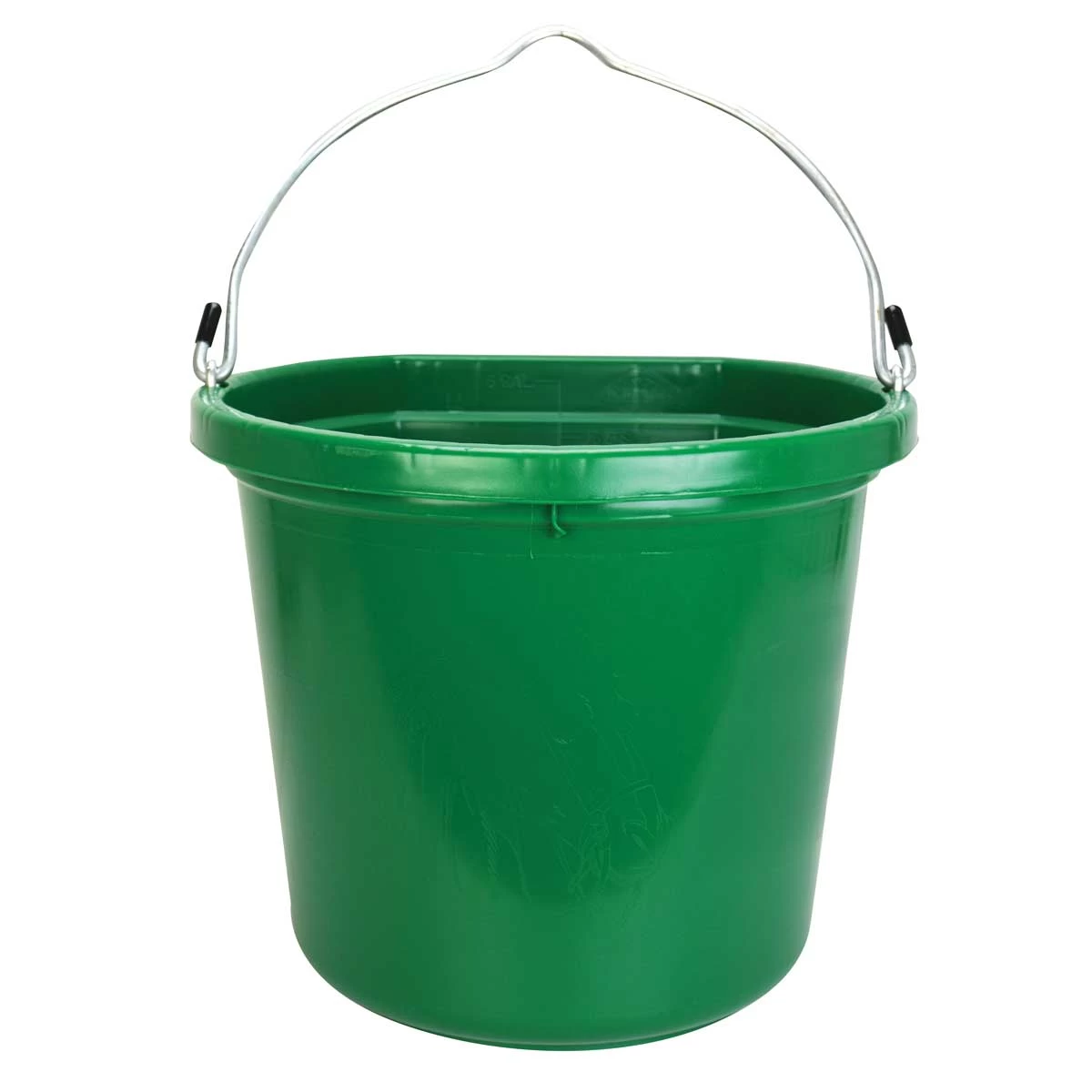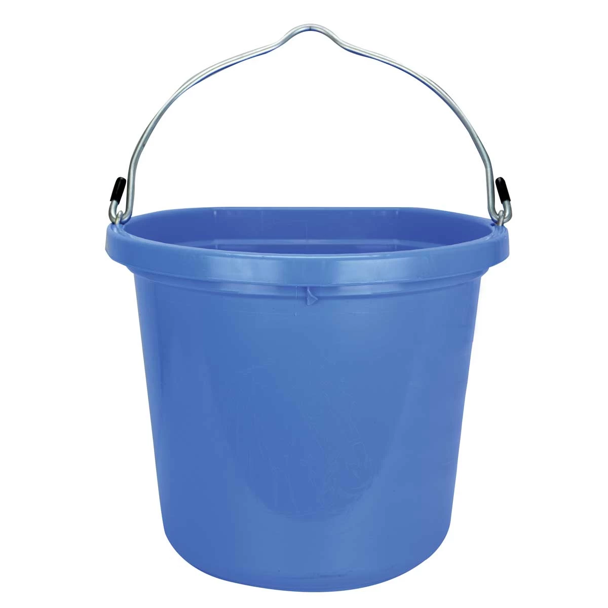 Fortiflex 20 qt plastic water bucket with a flat back. The flat back allows the bucket to lay flat against the wall and provide ample space for the horses head to fit comfortably to drink.