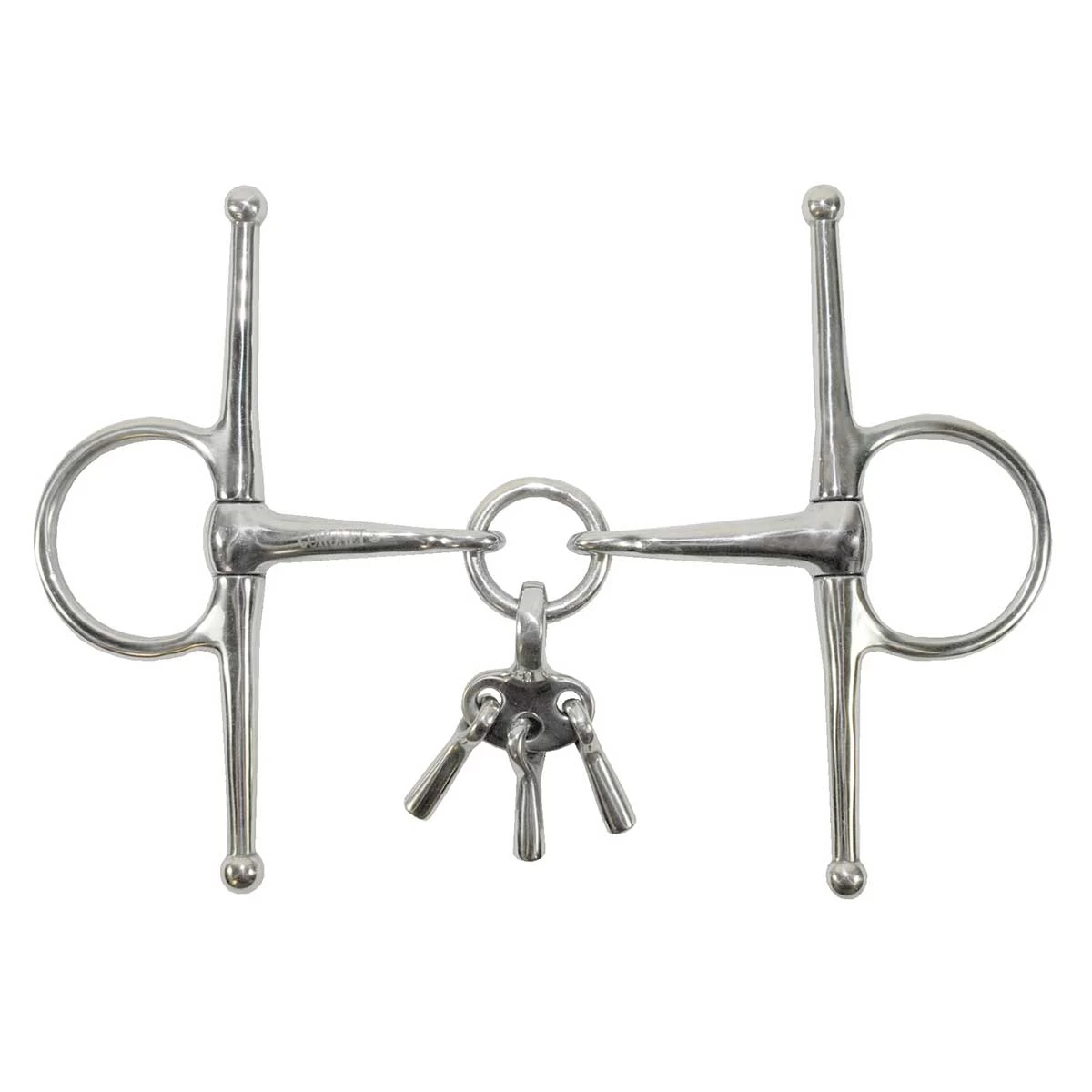 This Stainless full cheek bit has a mouth piece with players attached, which act as a pacifier for a horse that tends to chomp on, or play with the bit.