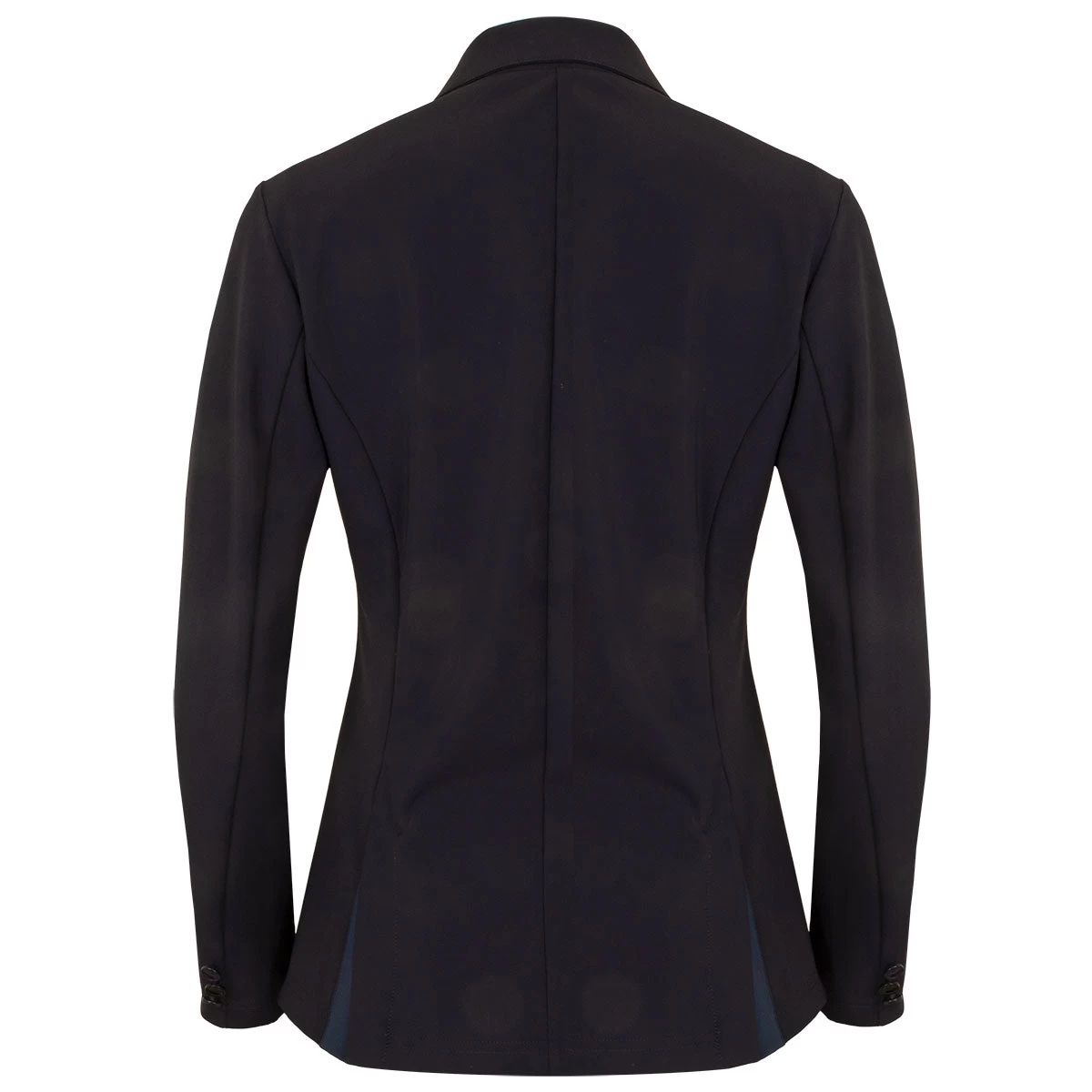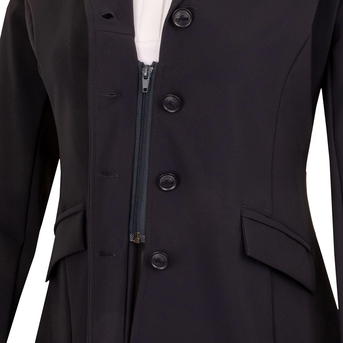 Madelyn Show Coat from the Grand Prix Quinn Series is an attractive four button Ladies show coat that is designed to move with the rider while providing a tailored classic look in the saddle. The hidden zip behind the classic four button closure keeps the front closure looking neat and tidy easily preventing gapping in the front, while high tech stretch TK fabric provides a figure flattering silhouette both in and out of the saddle. The Madelyn show coat is an easy care must have addition to your show attire.