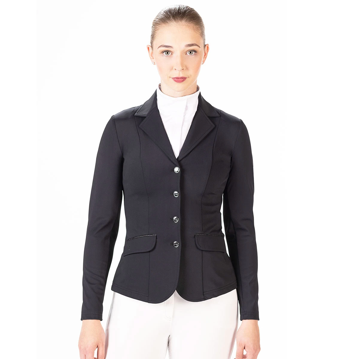 Ride the ring with class and style in the HKM Luisa Competition Ladies Show Jacket. This jacket is available in the same style in both black and navy to cover all of your horse show needs. This show coat is breathable and dirt resistant and has 2 large outer pockets. Featuring a tailored fit and crease resistant material, you will be sure to shine bright in the show ring.