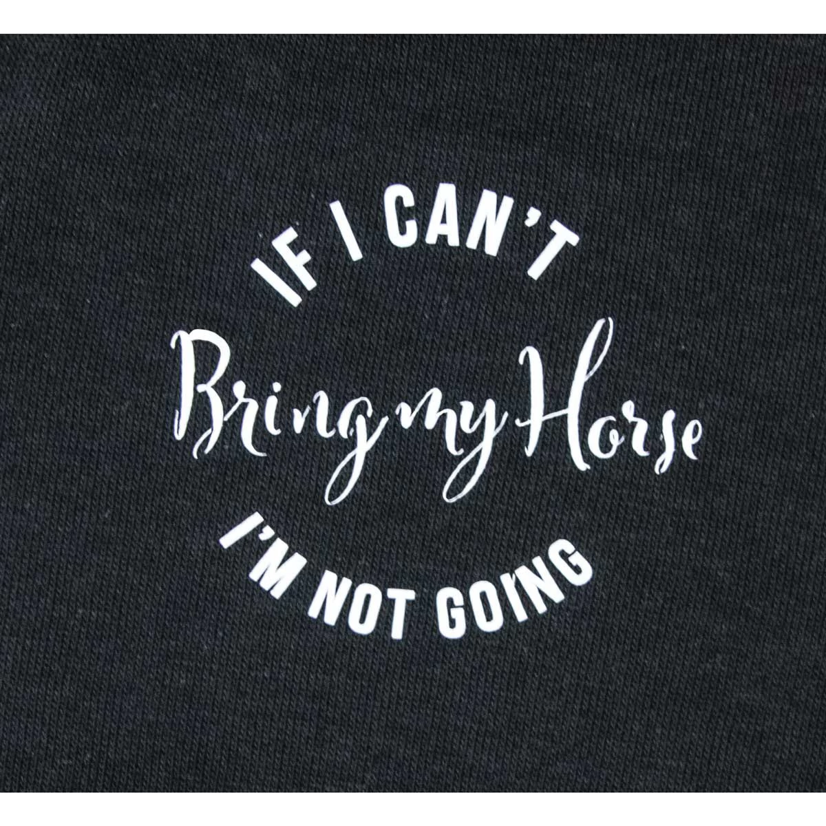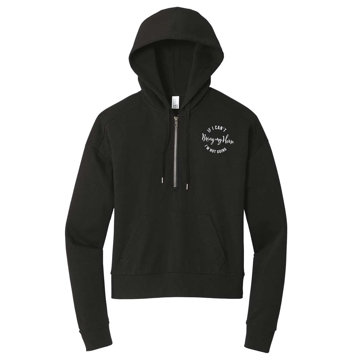Soft hoodie with decal logo on left chest stating “If I can’t bring my horse, I’m not going”. This cozy fleece pullover features a 1/2 zipper, drawcords with metal tips, rib knit cuffs and hem. This pullover is great for lazy days at home or around the barn! Shop coordinating Joggers and shorts.