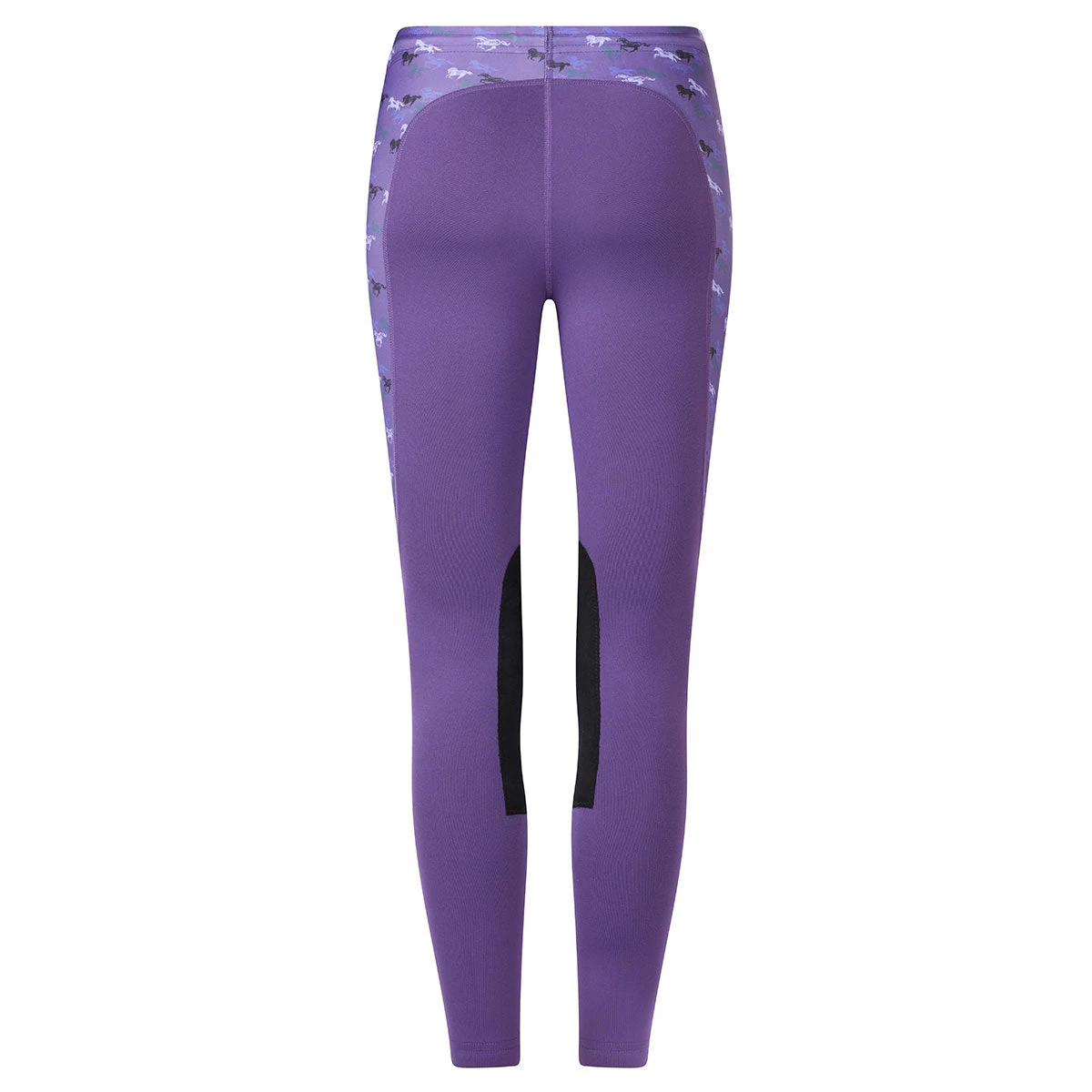 Your little rider will love how fun the Kerrits Knee Patch Girls Performance Tights are. The purple leggings with the purple pony printed side panels makes for a fun outfit for everyday riding. Featuring a lightweight, moisture wicking, and odor resistant fabric for ultimate comfort and durability.
