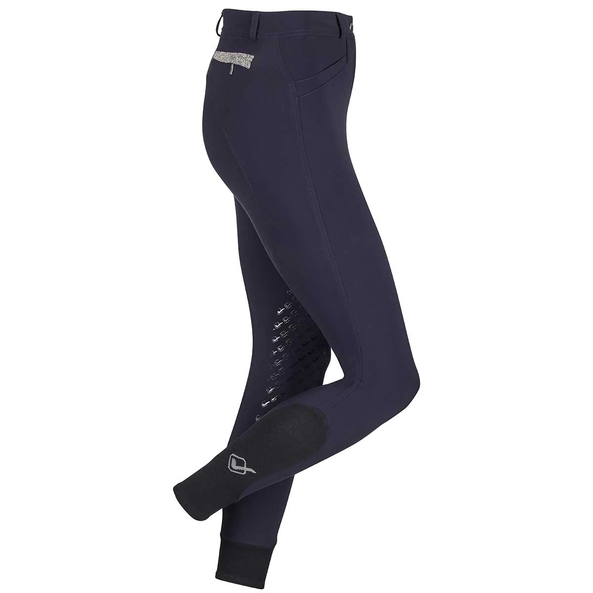 Add a touch of sparkle to your wardrobe with the LeMieux Dynamique Knee Patch Ladies Breech. Made from high durability, 4-way stretch fabric which is soft and comfortable with a tapered lower leg design and mesh stretch seamless anatomic sleeve. Optimized for comfort with a seamless design and supportive, elasticated high waist. Silicone knee grips adds security in the saddle. Two front side pockets are perfect for phones and valuables and the two zip back pockets are finished with a shimmer of gems for added sparkle.
