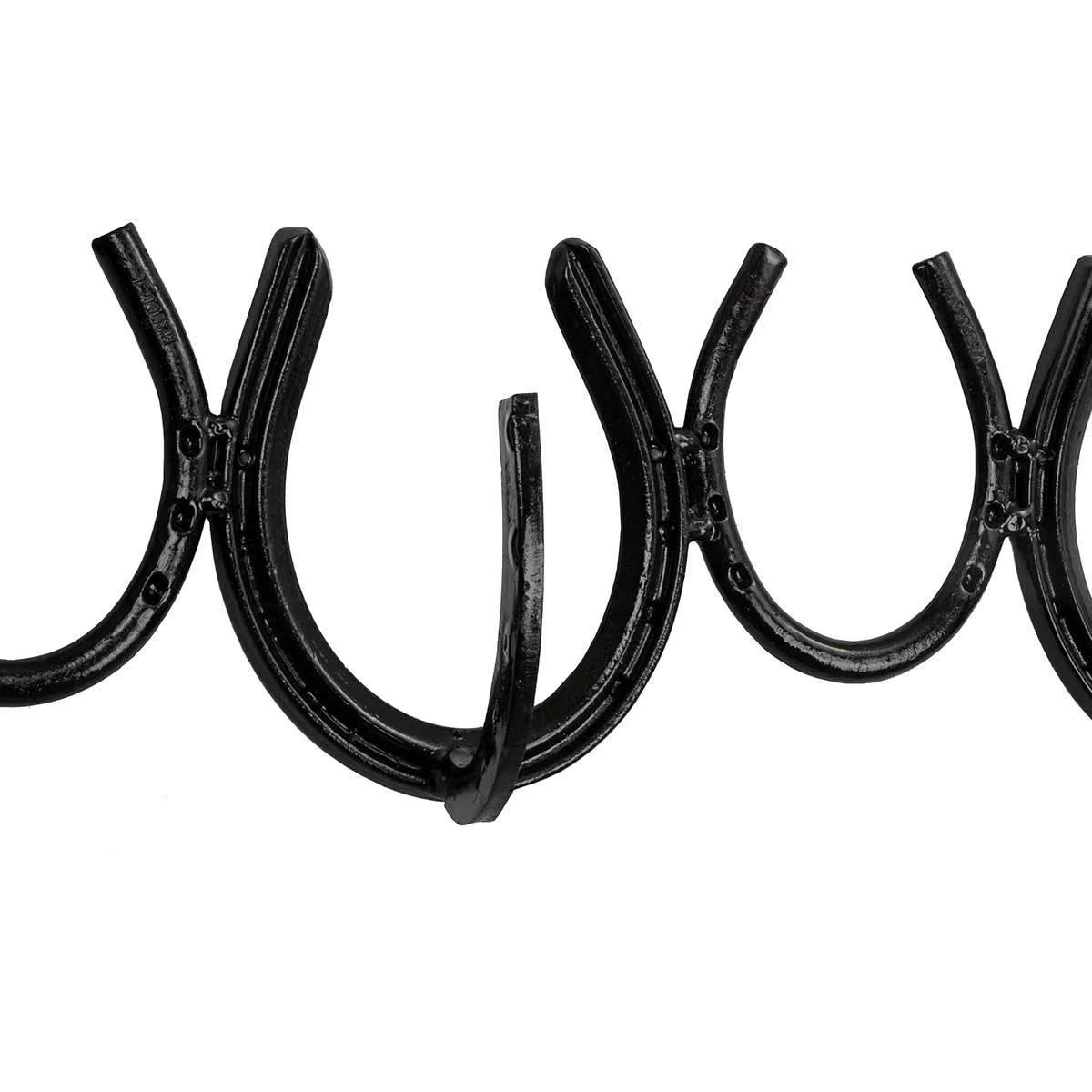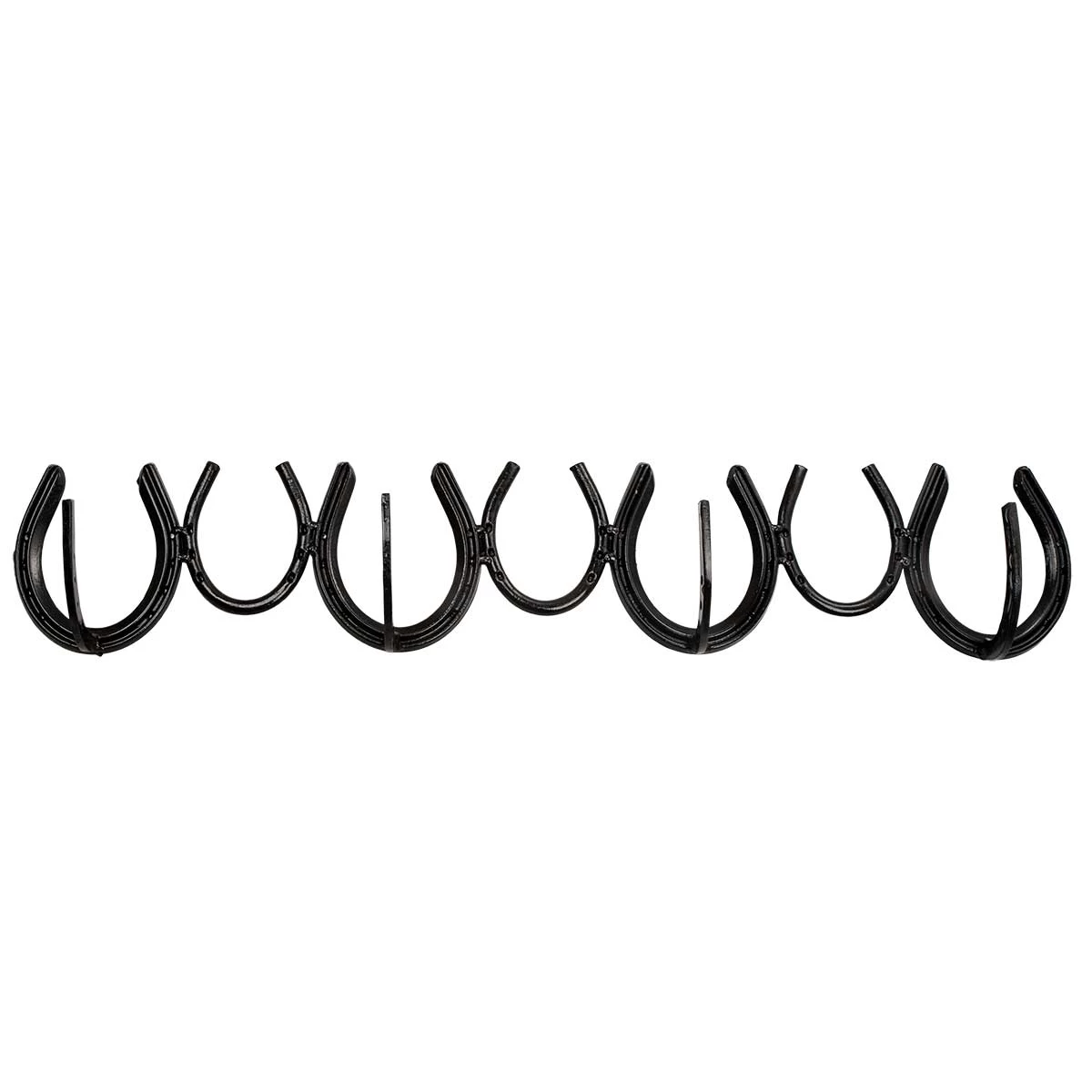 The Newport Blacksmith Horseshoe Tack Rack is perfect for the barn and for home in providing a sturdy, reliable option to hanging tack, clothing, and more. Made of solid steel horseshoes and powder coated for durability, this large 4-hook design is great for tack, blankets, or as a clothes rack.
