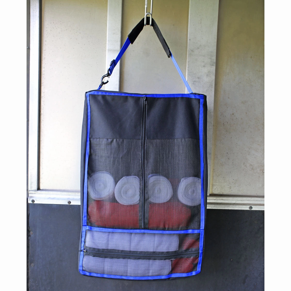 Large Bandage and Quilt Bag for hanging with 3 nylon loops or for traveling to shows with adjustable padded shoulder strap. Durable 600D nylon, PVC coated flexible mesh front with plenty of space for all your leg wraps, bandages, polos, sheet cotton and more.