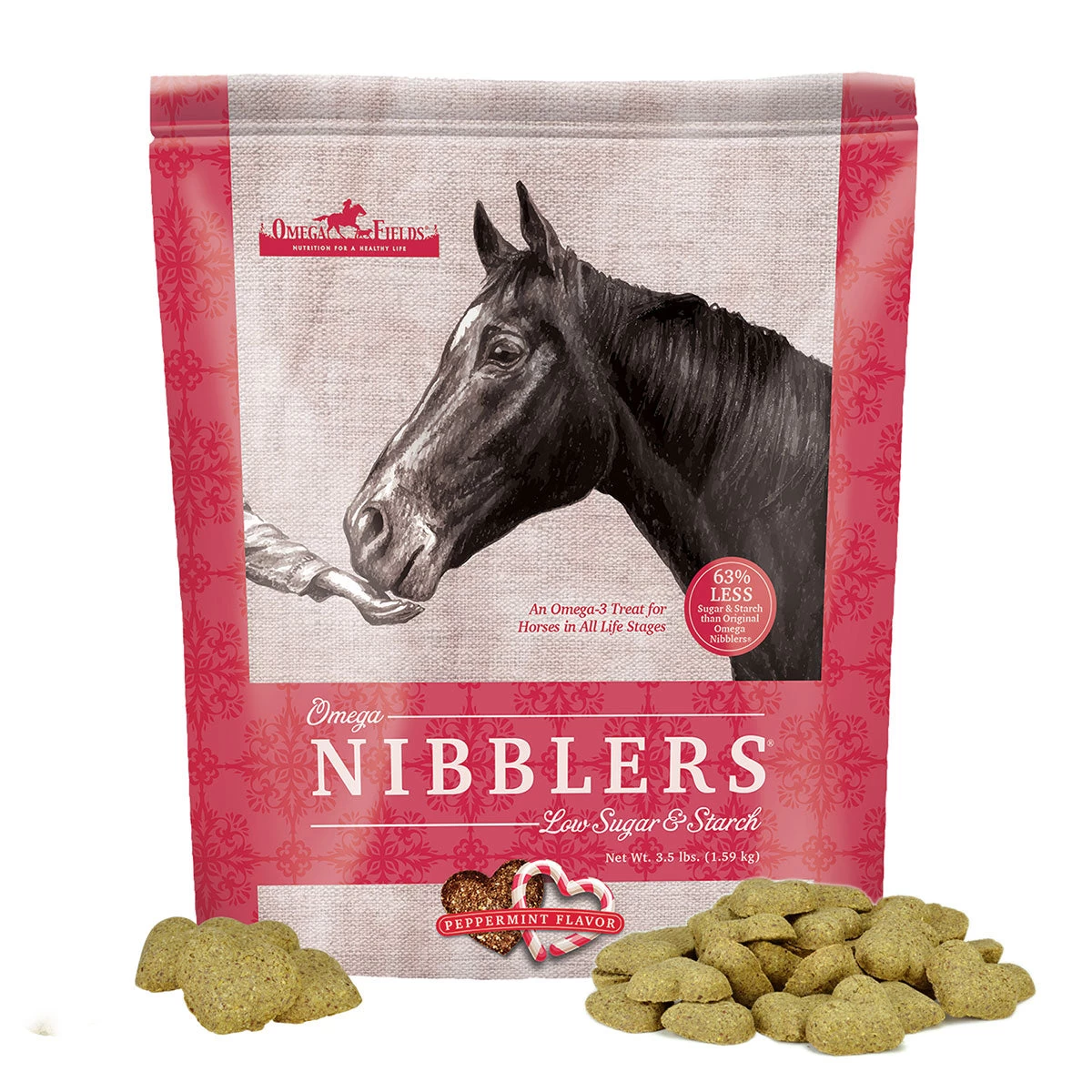 Omega Nibbler Treats by Omega Fields Perfect for all horses and especially for horses that have metabolic issues. Made with 65% less sugar and starch than the original Nibblers. These peppermint flavored treats are sure to be your horse’s favorite and they are nutritious as well as delicious!