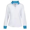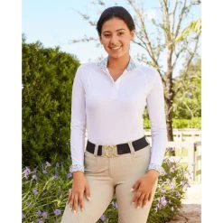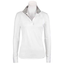 The RJ Classics Maddie 37.5 Ladies Show Shirt blends cutting edge technology with traditional styling to form the perfect synergy. The fabric features 37.5 patented thermo-regulation technology which has proven to help your body manage its core temperature and therefore, increase stamina. It keeps you comfortable by helping your body to maintain an optimum core temperature of 37.5° Celsius (99.5° Fahrenheit) which is ideal for peak athletic performance. The particles are naturally derived and work for the life of the product (it will never wash out!) This style also features a fun dog themed trim detail, a textured mesh for added comfort and breathability, and a zipper placket with snap collar to modernize this traditional look.
