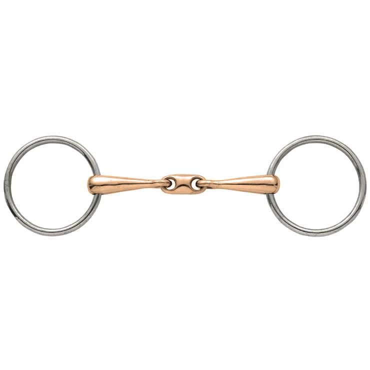 The Shires Copper Alloy French Link Loose Ring Snaffle is a bit that encourages contact while discouraging leaning. French links or double jointed snaffle bits lay flat across the horse’s tongue and are generally more comfortable and more readily accepted by the horse. The addition of Copper Alloy aids in salvation also allowing the horse to be more willing to accept the bit. Due to their mildness, loose rings are a commonly used bit for young horses.